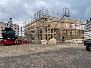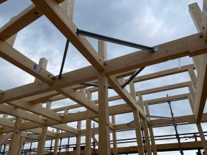 2階の床が貼り終わり、柱を立てています