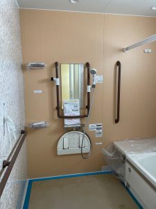 お風呂も広く、介護用の特別なタイプで浴槽を左右に移動できます。